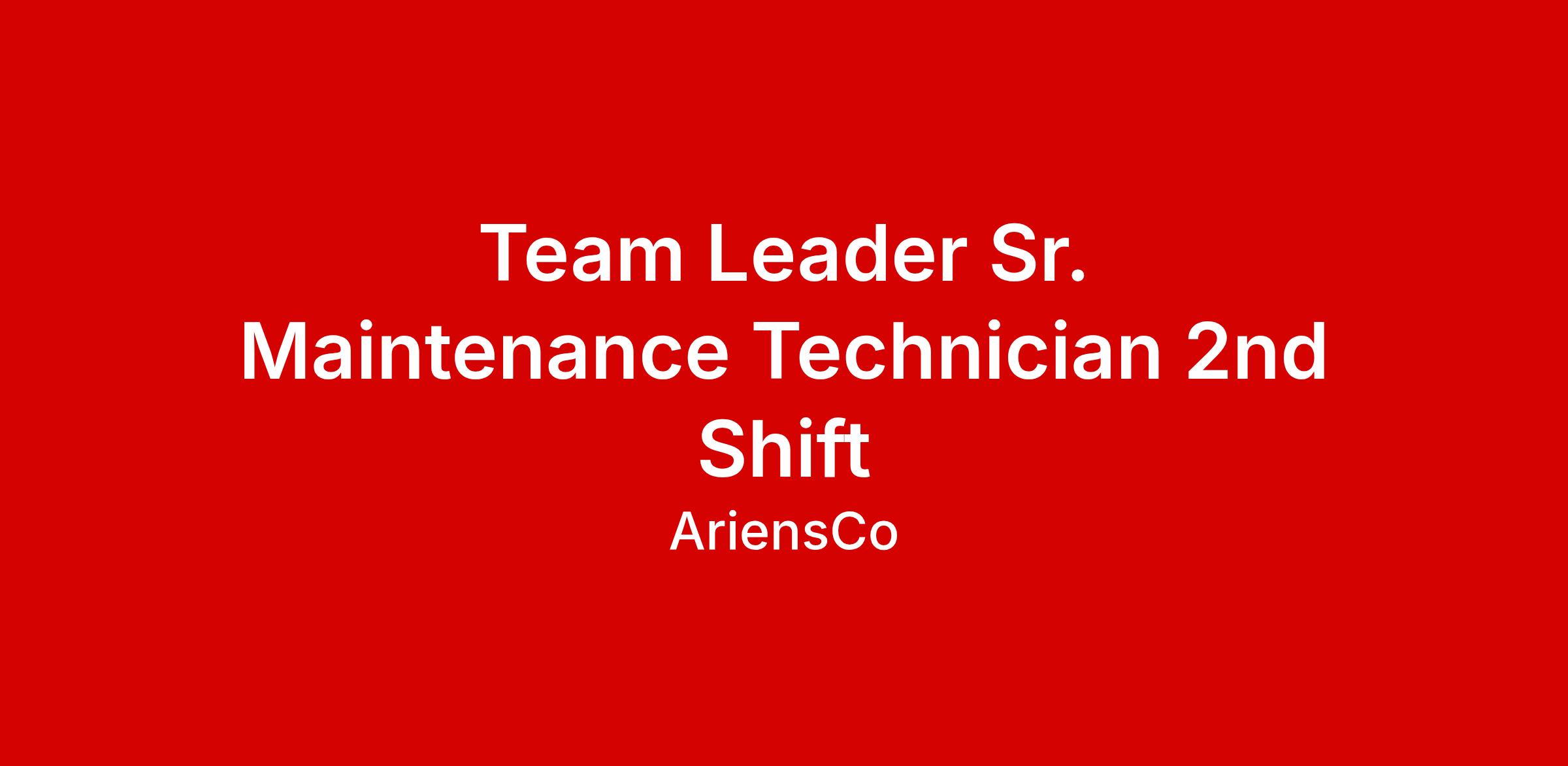 Team Leader Sr. Maintenance Technician 2nd Shift